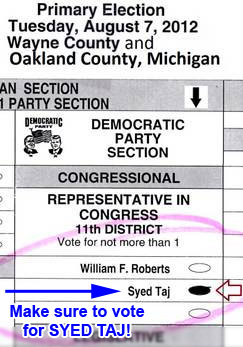Thanks to Dr. Taj being an excellent candidate and running a solid campaign already, the spectacular, jaw-dropping downfall and abrupt resignation of incumbent Republican Congressman Thaddeus McCotter from the 11th District has given Dr. Taj a real shot at winning this normally Republican-leaning district. However, in order to do so, he first has to beat the LaRouche candidate in the August primary.
