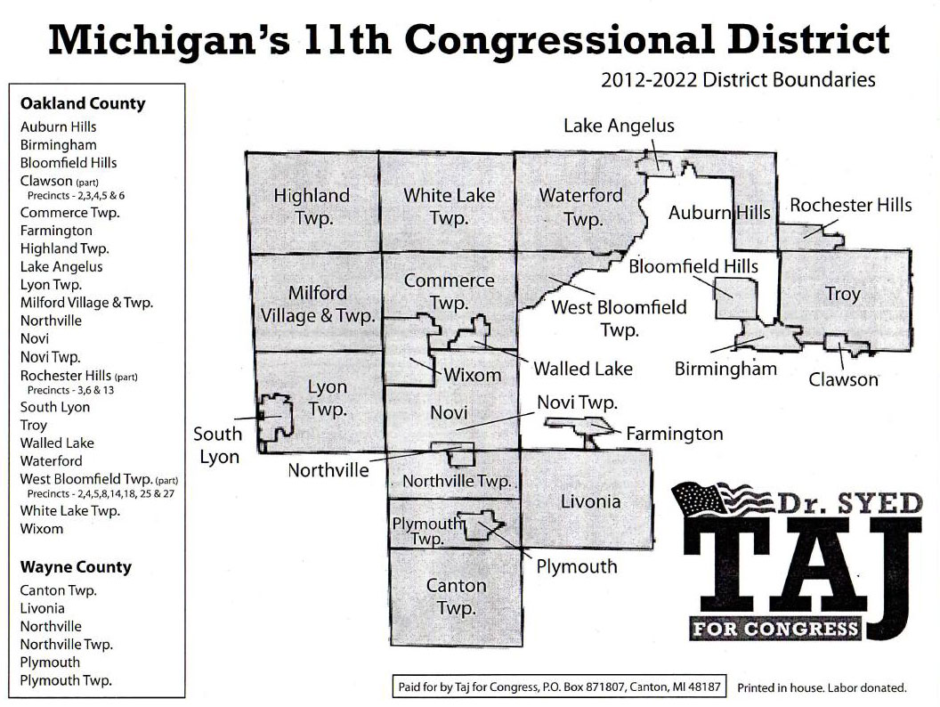 If you live in any of the following municipalities, you're part of the new 11th District; please make sure to vote for SYED TAJ on August 7th, along with U.S. Senator Debbie Stabenow: